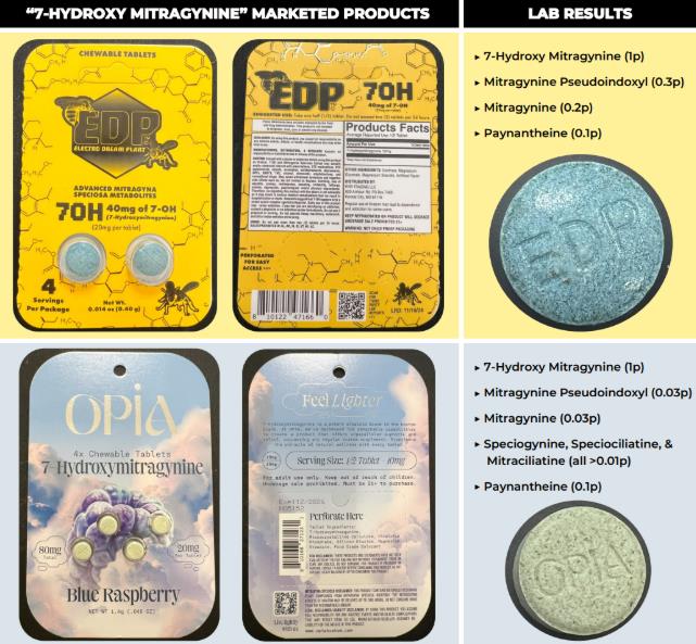 Image from United States Food and Drug Administration showing 7-OH mitragynine extract (left), powder (middle), and gummies (right).